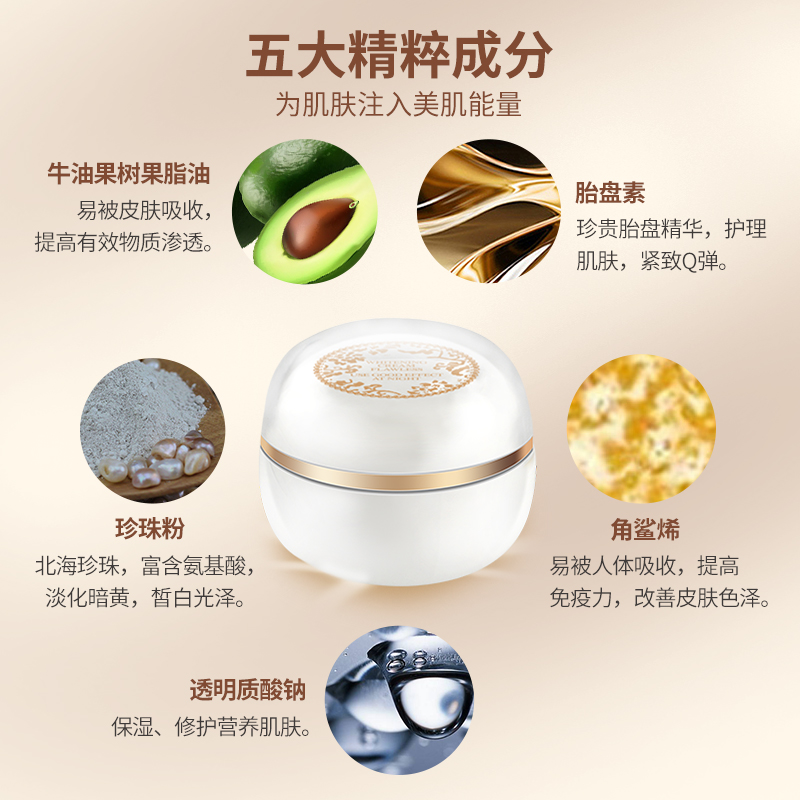 【產(chǎn)品成分】:牛油果樹果脂油,角鯊烯,胎盤素、透明質(zhì)酸,珍珠粉,生育酚等