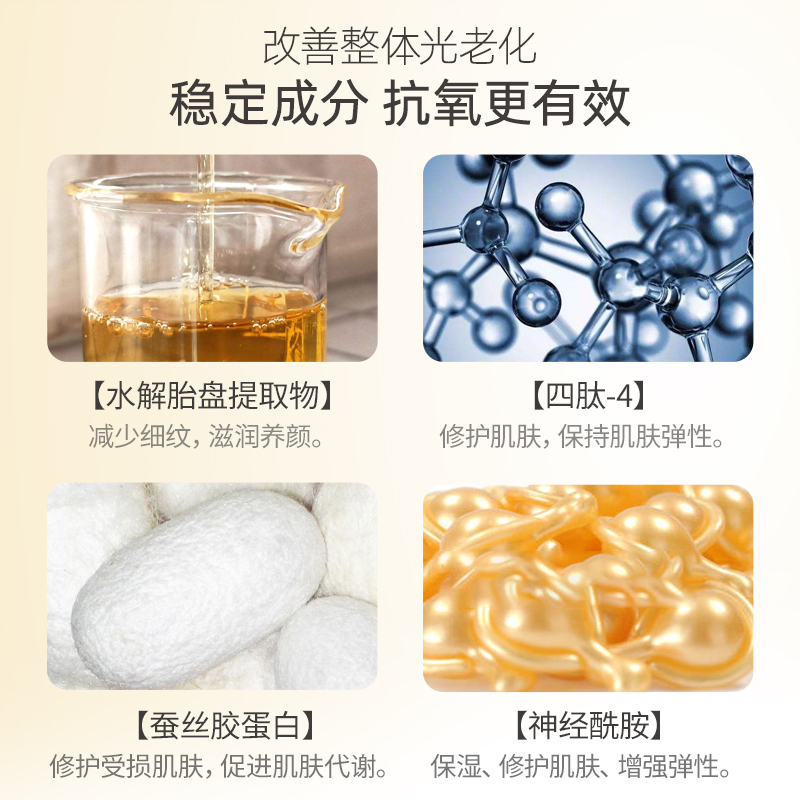 【產品成分】:水解胎盤提取物、富勒烯、四肽-4、蠶絲膠蛋白、神經酰胺 1等。